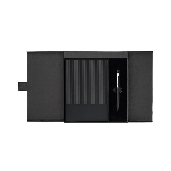 Zestaw składający się z notesu A5 (80 kartek w kratkę, 80 g/m2) i długopisu z niebieskim wkładem. Zestaw zapakowany w eleganckie pudełko.