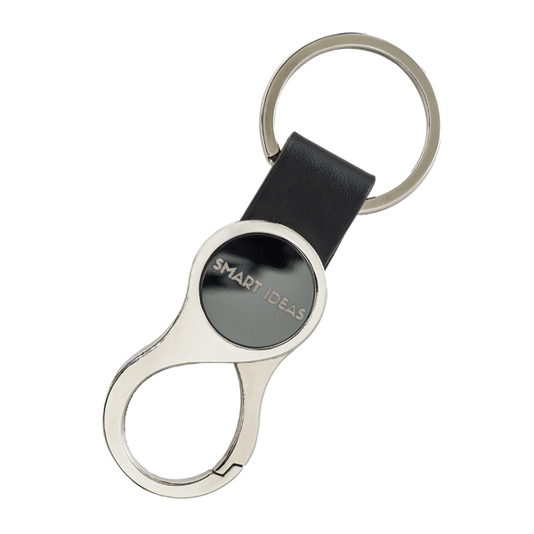 Brelok będący eleganckim połączeniem metalu i ekoskóry. Pakowany w czarne kartonowe opakowanie upominkowe.